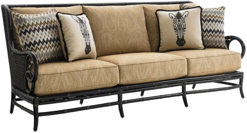 Deep seating defines this sofa, which features a contemporary shelter back that frames an intersecting circle pattern. The curve of the arms highlight a sophisticated weave of all-weather wicker with gold accents on the panels and a bamboo motif on the frame.Read More