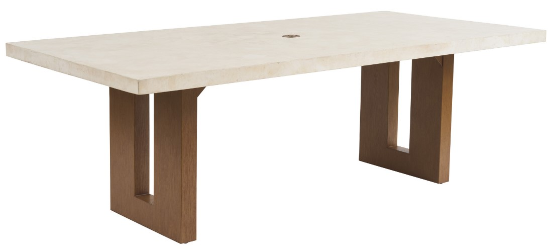 The 88-inich rectangular dining table features a split pedestal base and a 2.25 inch thick White Agate veneered stone top, offering comfortable seating for 6 guests. The table top has a concealed pass-thru in the middle to accommodate an umbrella.Read More