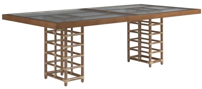 The rectangular dining table accommodates 8 guests comfortably. Its double pedestal base supports a top with wavy glass inserts. The center of the table features an umbrella passthrough, with a monogrammed TB insert cap when an umbrella is not used.Read More