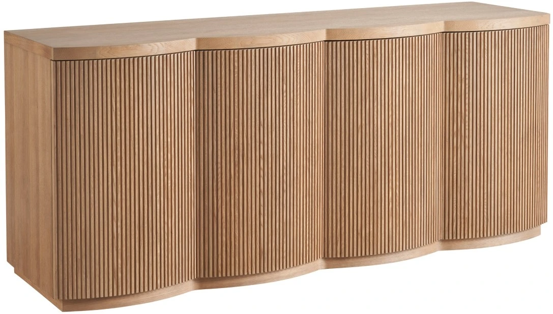 The Lumi Credenza stands out with its four tambour-wrapped doors, featuring touch latches for a sleek, hardware-free appearance. The entire body is adorned with delicate vertical ridging, adding a layer of depth and visual appeal to the piece. This design choice enhances the credenza's overall aesthetic.Read More
