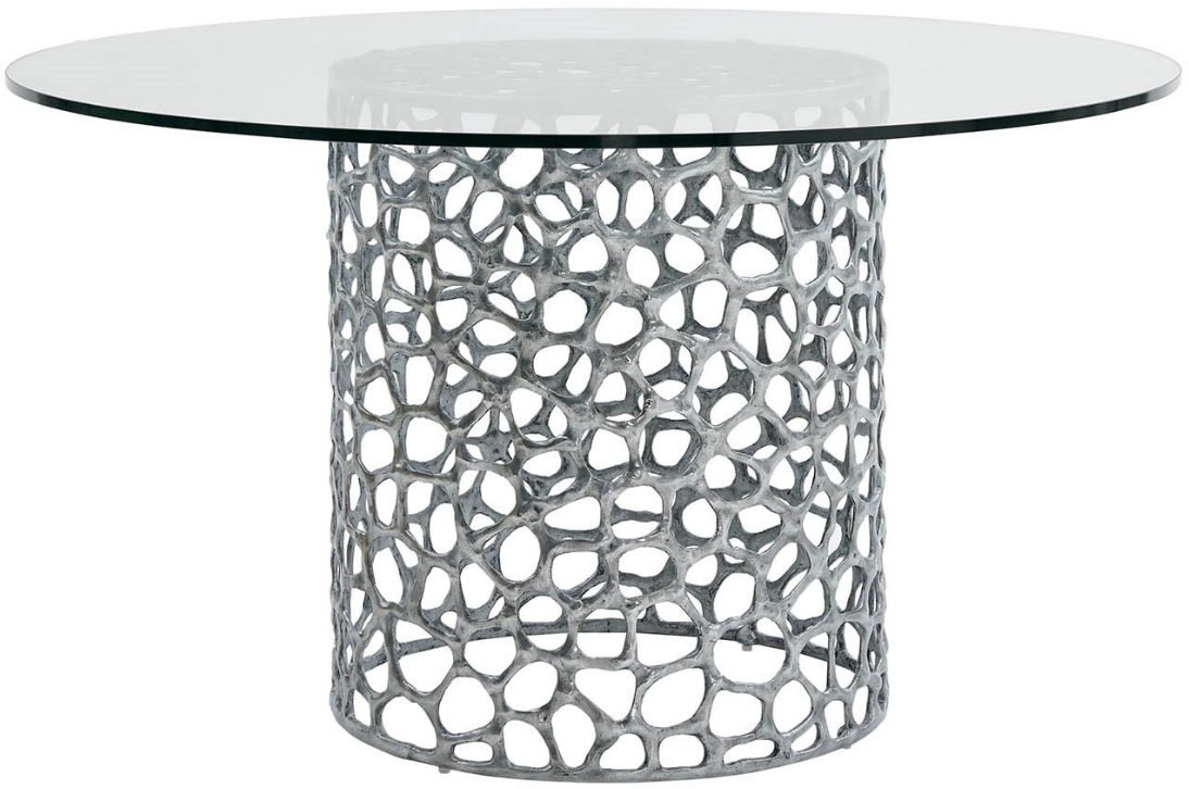 The coral dining table features a round glass top supported by a coral-inspired cast aluminum base in an elegant antique nickel finish. This dining table's transparent top enhances the sculptural base, creating a statement piece that embodies coastal elegance.Read More