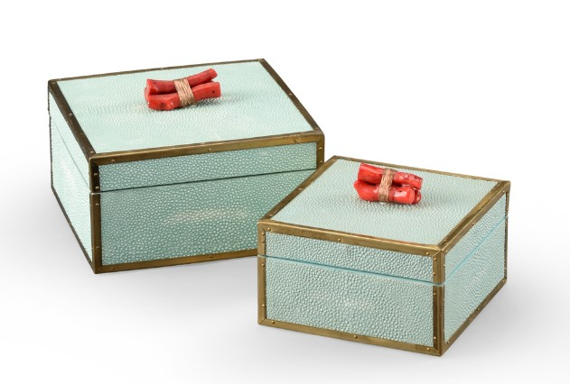 Combine beauty and function into your coastal themed home with this set of two faux coral boxes. Covered in sea mist blue faux shagreen with antique brass trim, these boxes are embellished with a faux red coral handle wrapped with twine.Read More