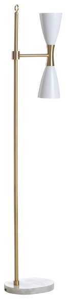This unique dual-light floor lamp will add mid-century style to your home or office. Natural white marble and warm antique brass parts combine with an hourglass-shaped white metal shade to create this retro-inspired design. Place beside an armchair for ample task lighting.Read More