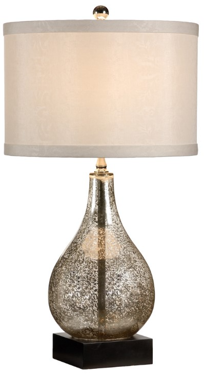 Mercury glass lamp features an antiqued glass with a gracefully curved teardrop design on a black wooden mounting. The off-white silk drum shade diffuses light while highlighting the brass finished accents. This modern table lamp is ideal for a bedroom or living area in any home or office.Read More