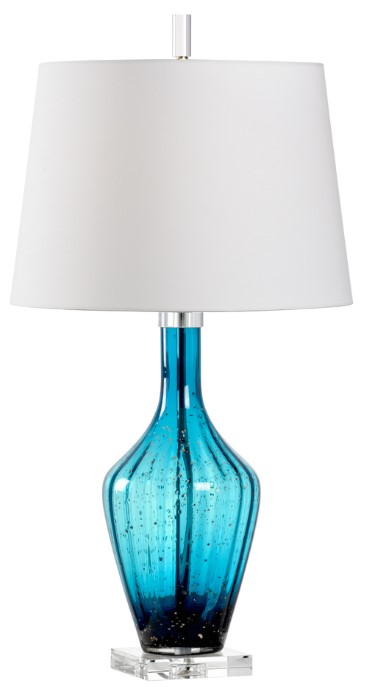 Elegant and alluring, this Beck Lamp has a blue bubble glass vase with metallic copper flecks, clear crystal mounting that will complement in any decor. Complete the look destined to make a statement that will stand out in your room.Read More