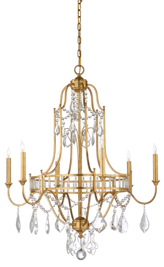 Enhance your space with our exquisite Buckhead Antique Gold Leaf Chandelier. Crafted from iron with clear crystals, this stunning lamp features six lights, exuding elegance and brilliance. Includes 9 feet of chain for easy customization. Illuminate your surroundings with timeless beauty.Read More