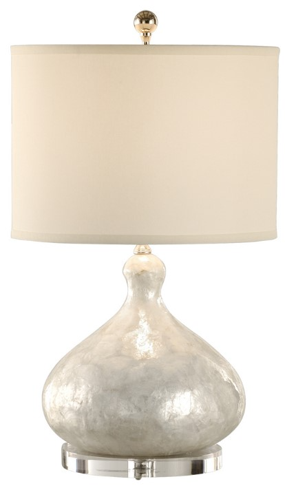 Display the effortless beauty of carefree coastal living with Capiz Shell Bottle Lamp. The translucent pearl tones of the Capiz shell are hand laid over a ceramic bottle vase creating a transitional light feature. A clear acrylic base, nickel ball finial and off white silkette drum shade complete the design.Read More