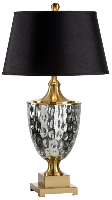 Combine modern mercury glass with a classic silhouette for a one of a kind table lamp. Christopher lamp is crafted in dimpled mercury glass with antique brass accents. A black silkette tapered drum shade completes the look and diffuses the light creating a luminous shine.Read More