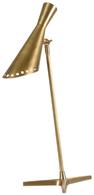 Provide mid-century modern style to your living space with our cliff may table lamp. This minimalist design is crafted of brass with a warm antique finish. The slender tripod base provides steady support to the column and contemporary hourglass shade with perforated detailing, allowing it to direct task light where needed.Read More