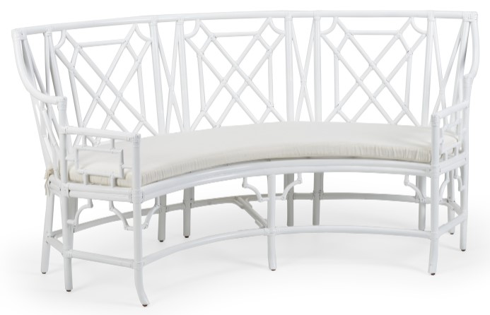White finish on rattan fretwork curved settee with attached off white fabric cushion