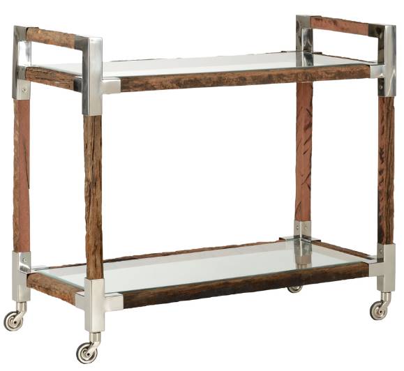Move the party from room to room with our rustic glam bar cart. Featuring reclaimed natural rough wood with polished nickel corner brackets for visual contrast, its two beveled glass shelves hold bottles, glassware, your favorite decorative accents and more. Casters allow you to transport snacks with ease.Read More