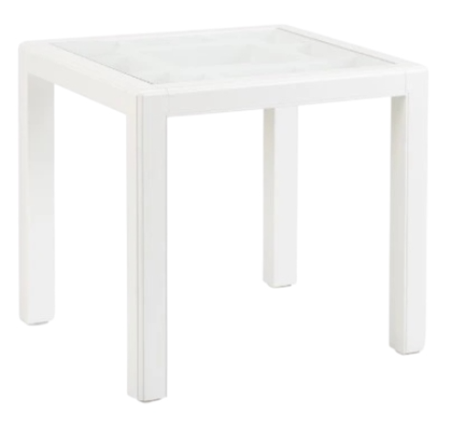 Wood trellis side table with clear tempered glass top, custom painted in customer's selection of any Benjamin Moore paint color. Please provide color name and number. Add this piece to your room decor and elevate the look of your space.Read More