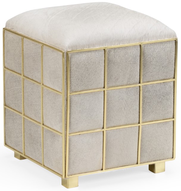 The Square Hide Ottoman has a brass square motif on light gray hair on hide. This rustic modern ottoman can be pulled up to any seating group and is best used as a group of 3. The top lifts off for storage.Read More