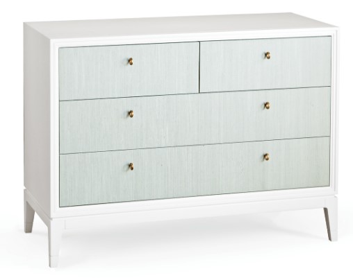 White painted cabinet with four light aqua abaca front drawers featuring brass pulls