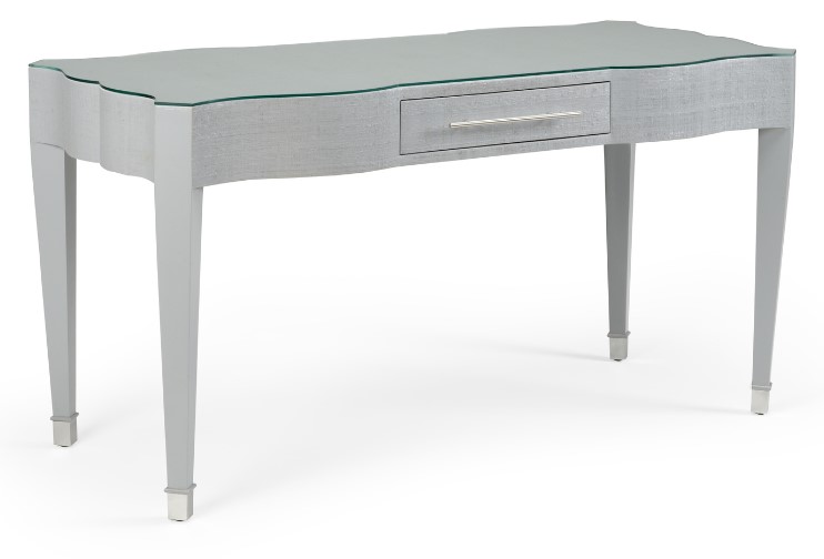 Harlee boasts a classic silhouette that combines with textures and fine detailing to create a transitional writing desk. Sheathed in gray painted raffia, it features one felt-lined storage drawer and a protective tempered glass top. The drawer is 3h x 17.25w x 17d with a polished nickel pull bar.Read More