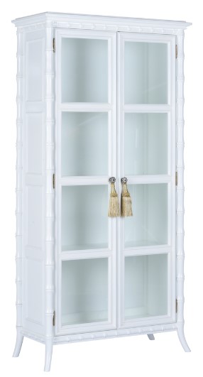 Nights in White Linen Cabinet is crafted of wood and features a stylish bamboo design with a white finish. Two clear glass doors open to reveal four wooden shelves for storing your favorite decorative accessories. The round, whitewashed bronze door pulls are adorned with a set of gold tassels.Read More