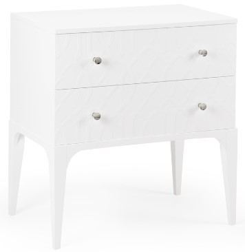 Enliven your bedroom by custom painting this modern wood nightstand in your selection of any benjamin Moore paint color. Its two drawers feature polished nickel-finished knobs and are ideal for storage. Please provide the color name and number. Available in the brass finish as an alternate hardware option.Read More
