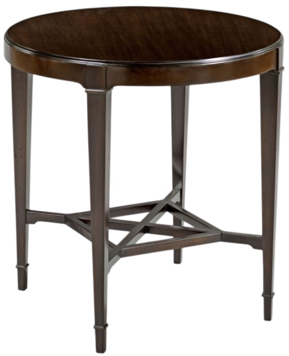 A transitionally styled side table with a round top that is veneered with mahogany veneer. The top is placed over four squared gracefully tapered posts that are joined by a low circular shelf.Read More