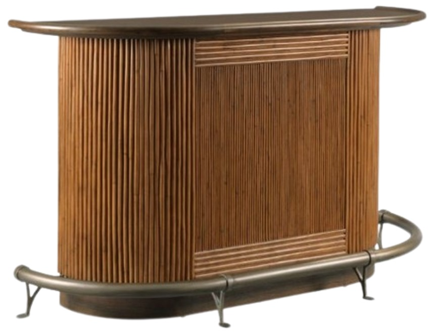 Belly up! This killer bar is designed in the spirit of Cuban early 20th century originals. The mahogany veneered top is adorned with a robust hardwood elbow rail. The top is elevated on panels enveloped with fine rounded rattan poles that house a handy storage drawer above a myriad of shelves for a variety of bar storage needs.Read More