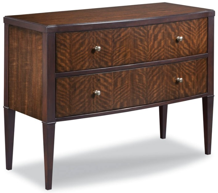 A handsome chest with Neoclassic style characteristics. A rectangular top is veneered with exotic Mozambique over two bow front drawers, also veneered with Mozambique. The case is raised by gracefully tapering legs.Read More