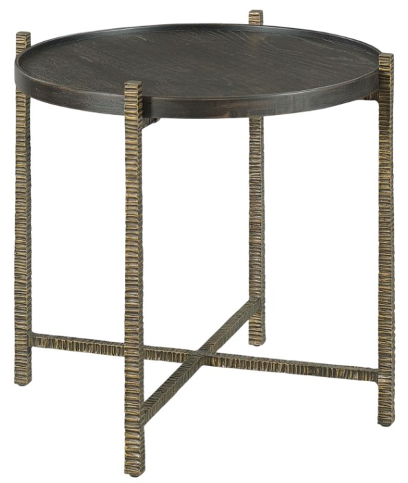 A galleried oak veneered top is finished in our Worn Black color supported by tapering textured metal legs that are joined by a low X stretcher and finished in an antiqued bronze. Make a bold statement by incorporating this stunning furniture into your home.Read More