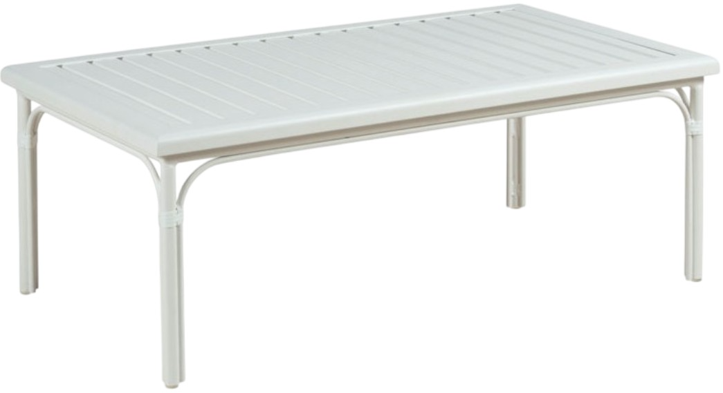 This Carlyle Cocktail Table from Woodbridge Furniture features a cloud white color finish. It is a square slatted top that rests over a powder-coated aluminum base styled in the fashion of rattan poles that is accented with bindings.Read More