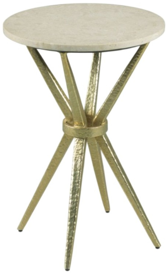 The Carmen Drink Table from Woodbridge Furniture is shown in Hollywood Gold finish and has a marble top. Tapering angular metal legs are joined at the center with a metal ring below a round 5/8" thick top fitted with Spanish marble.Read More