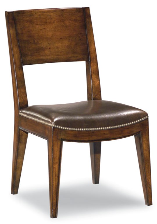 Graceful tapering legs elevate a saddle seat that is upholstered with top grain leather accented by nail trim. Add a unique and eye-catching style to your home by incorporating this Cashiers Side Chair into your room.Read More