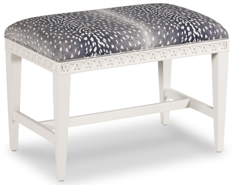 Introducing the Woodbridge Furniture Clark Navy/White Dove Bench - a perfect blend of elegance and functionality. Its rectangular upholstered seat sits atop side rails adorned with intricate pierced fretwork. Crafted from hardwood solids, this bench stands on square tapering posts, adding a touch of sophistication to any space.Read More