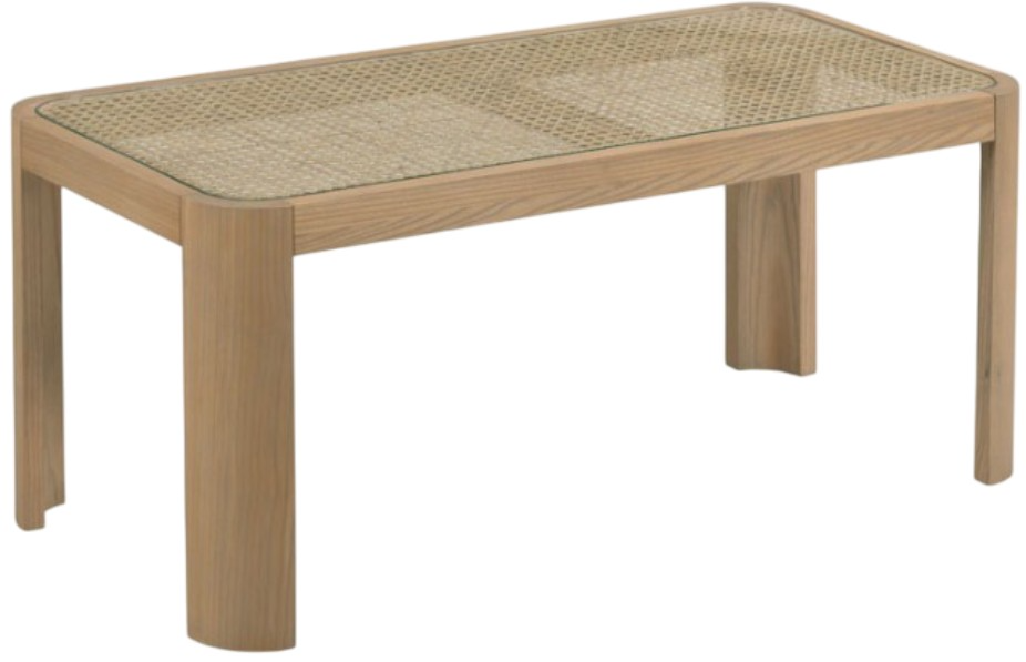 Clean lines and minimalism define the design of the Coachella rectangle table, an inset glass top is accented with an open woven cane beneath elevated on gently quarter rounded legs.Read More