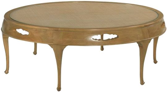 A curious table designed in the spirit of 18th-century originals. A round inset glass top rests over linear modern woven cane. Shaped apron rails are pierced in cloud-like shapes and elevated on cabriole legs.Read More