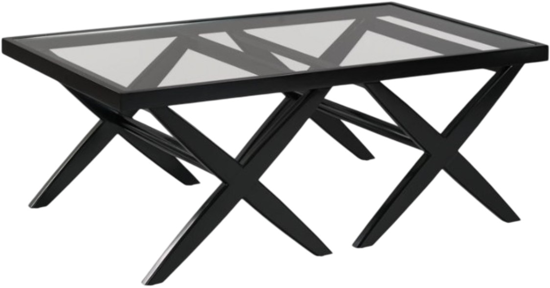 Unique in form, this cocktail table features double X bases joined by a stretcher. Fitted with an inset glass top. Elevate your living room or dining room with the Benjamin Cocktail Table from Woodbridge Furniture.Read More