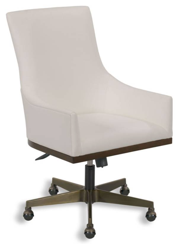 A curved upholstered back forms descending curved arms that flank an upholstered seat elevated on a wood seat frame with five tines and wheels. Elevate your office room with the Dinah Mink/White Vinyl Desk Chair from Woodbridge Furniture.Read More
