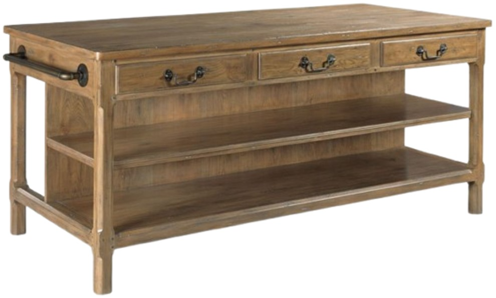 A significant design for kitchens inspired by the Arts and Crafts style movement featuring a weathered finish rough sawn texture. The rectangular planked top rests over sturdy chamfered posts and an apron rail that is fitted with three drawers over two handy shelves.Read More