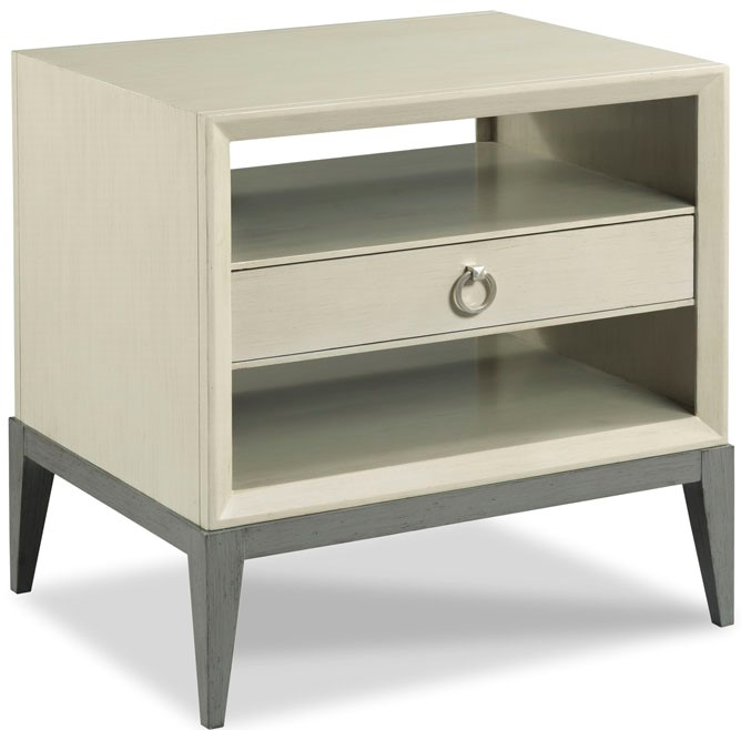 This Ramsey Essex Graystone Bedside Table from Woodbridge Furniture is a rectangular top rests over two open compartments and a middle drawer. The case is elevated on a base of tapering legs. Painted in two hues, sahara and graystone for a subtle contrast.Read More