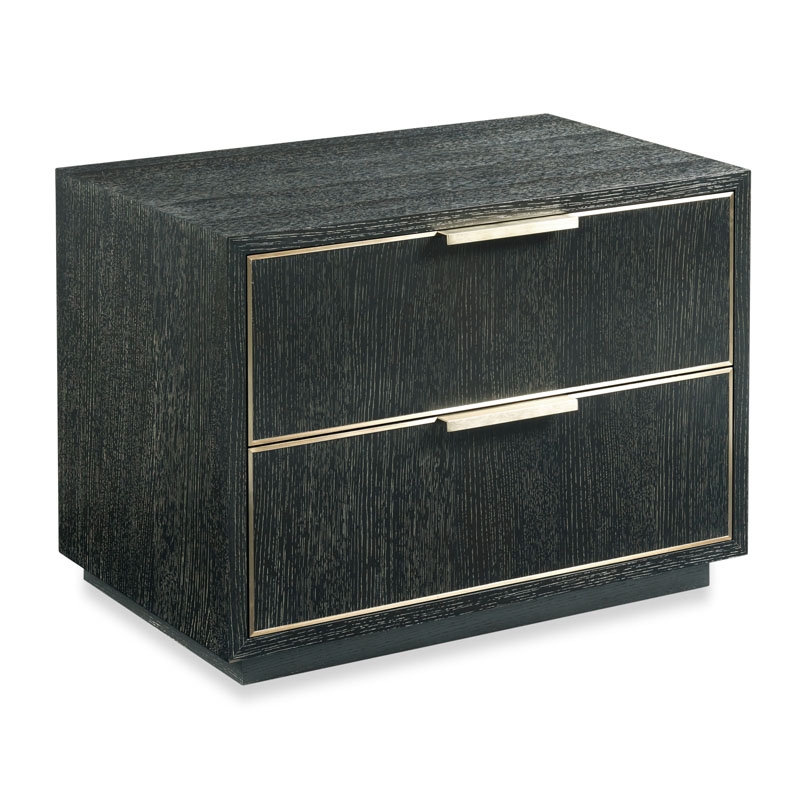 As shown, this Irvine Bedside Chest from Woodbridge Furniture is an Art Deco inspired cabinet with a rectangular top over two ample drawers fitted with soft closing slides accented with brass moldings raised on an inset plinth base.Read More
