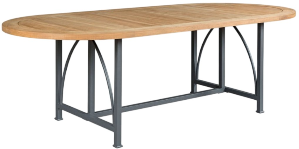 This Natural Teak/Graphite Gray Outdoor Dining Table is a wonderful outdoor dining table with a racetrack-shaped slatted teak wood top elevated on a metal base with squared legs accented by a graceful support arch.Read More