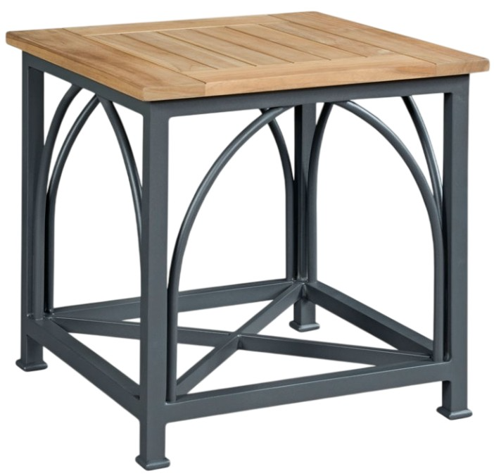 A handsome side table designed for outdoor purposes has a square slatted teak wood top elevated on a metal base with squared legs accented by a graceful support arch. Add function while adding style to your living space.Read More