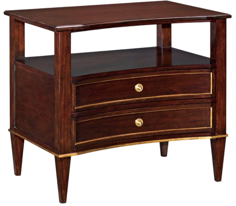 A wonderful table inspired by 19th Century Italian originals. The molded top rests over square corner posts that support two concave drawers below an open area for books or a clock. Finished on the back.Read More