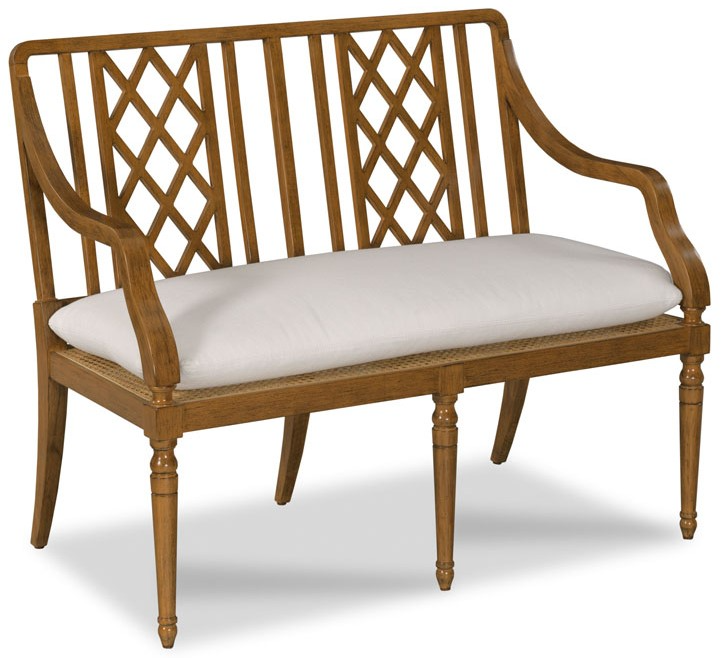 This lovely settee was adapted from the style books, The Cabinet Maker's and Upholsterer's Drawing Book, of Thomas Sheraton of the 18th century. The pierced fretwork back is elevated by turned front legs and gracefully tapered flare legs at the back. The seat is accented with an open traditional cane and a loose upholstered seat cushion.Read More