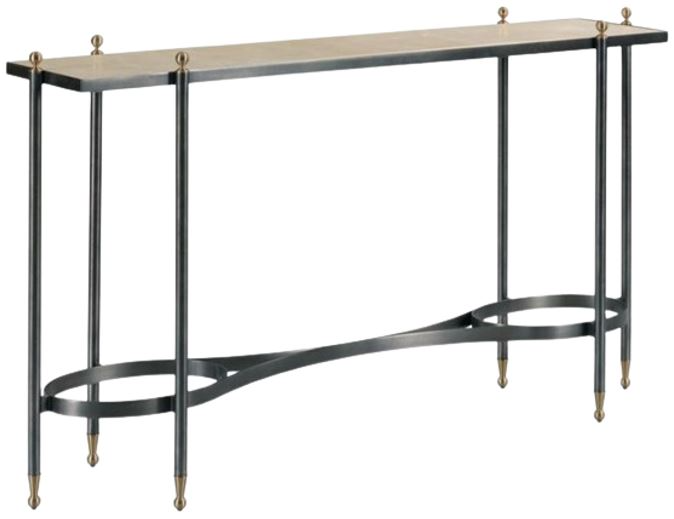 A lovely table adapted from mid 19th Century French garden furniture. Round metal posts crowned with brass finials support a rectangular inset stone top over a curvaceous and intricate metal stretcher.Read More