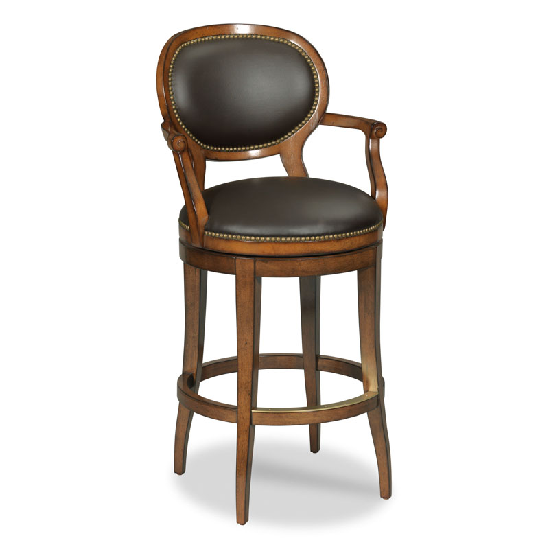 A graceful counter stool built for comfort. An upholstered oval back accented with brass nails is situated above an upholstered swivel seat raised by shaped legs. Include this upholstered counter stool in your home to bring out the beauty and style of your dining room.Read More