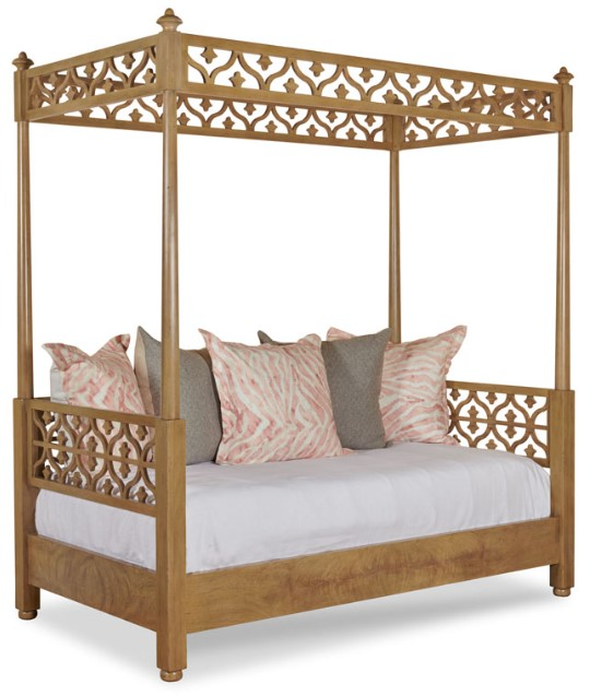 A terrific day bed that is a blend of French and Asian styles from the 18th Century. Four pierced fretwork tester rails top four rounded tapering corner posts over pierced fretwork side and back panels elevated on stylized bun feet.Read More
