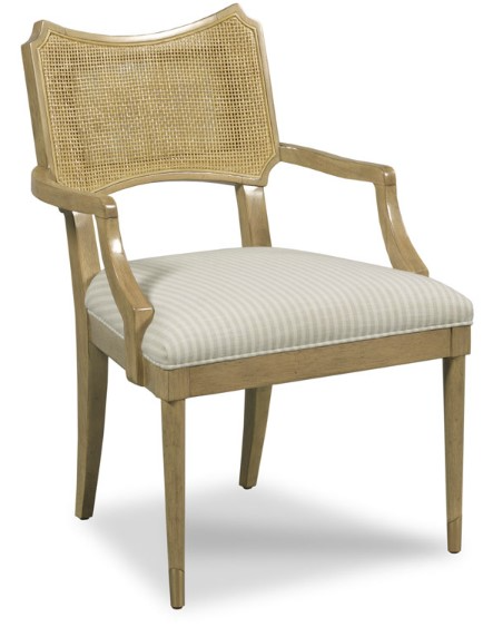 A handsome chair adapted from French Empire styles from the 19th Century. A shaped back is incised with linear natural cane between curved arms above an upholstered seat elevated on tapering legs.Read More