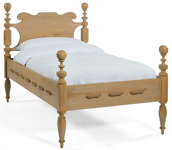 The posts elevate a low ram's head-shaped headboard over side rails that are fitted with a rope detail simulating rope bedding supports that were used during the 18th century. During the period, ropes were tightened periodically as they stretched from use. Thus, the expression "sleep tight" was born. Bunkie board in lieu of traditional boxspring is recommended.Read More