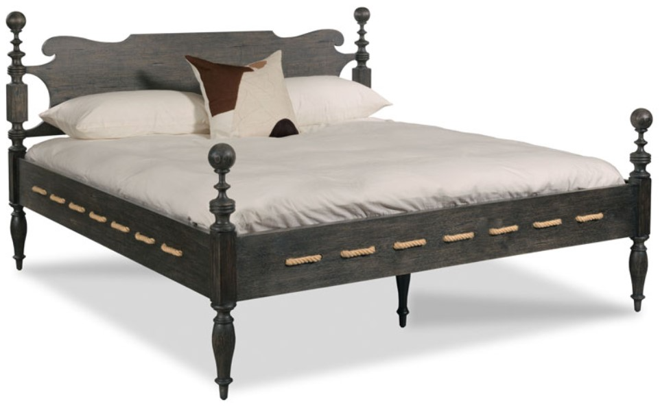 The posts elevate a low ram's head-shaped headboard over side rails that are fitted with a rope detail simulating rope bedding supports that were used during the 18th century. During the period, ropes were tightened periodically as they stretched from use. Thus, the expression "sleep tight" was born. Bunkie board in lieu of traditional boxspring is recommended.Read More
