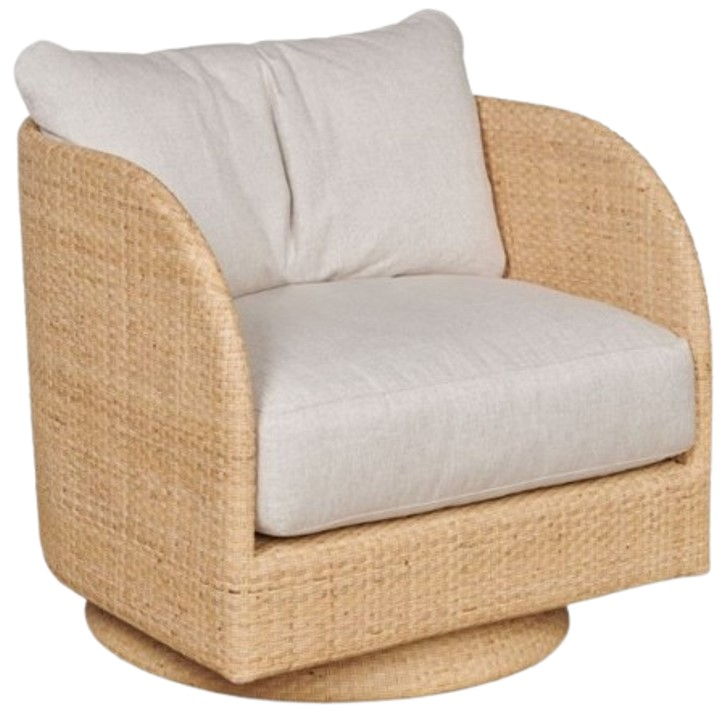 A wonderful lounge chair with a barrel back design crafted from natural rattan that is fitted with a loose cushioned back over an ample upholstered seat cushion over a swivel base.Read More