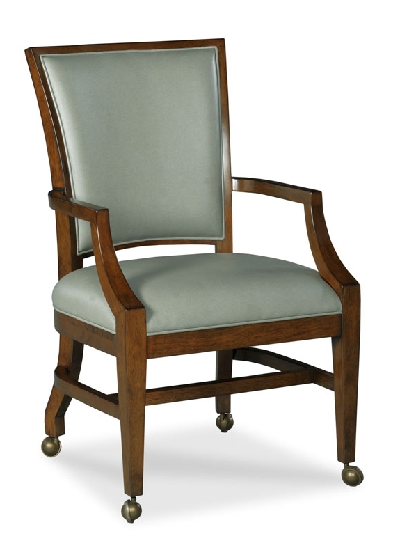 An upholstered back resides above curved arms and the upholstered seat is raised by tapering legs that are fitted with sturdy casters. Add this chair to your dining room decor and elevate the look of your space.Read More