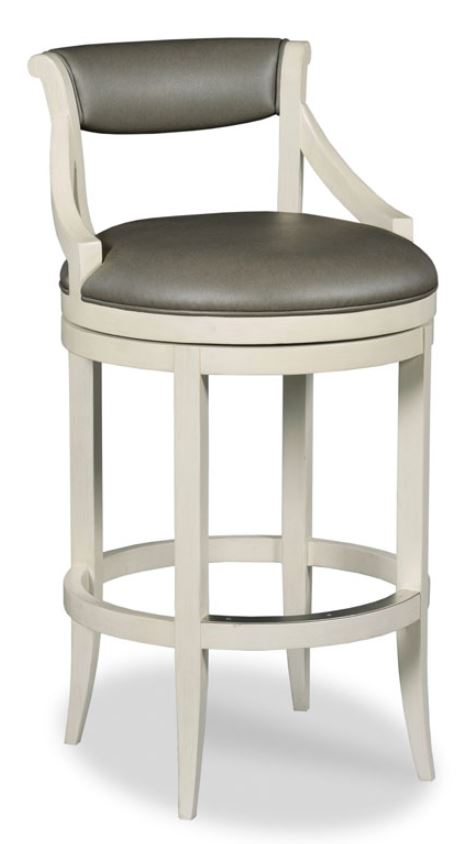 The Taylor bar stool from Woodbridge Furniture is the perfect piece for your dining room design, shown in Carrara finish and with Gray Vinyl for its fabric. A curved upholstered top rail rests above an upholstered seat raised by squared tapering legs.Read More