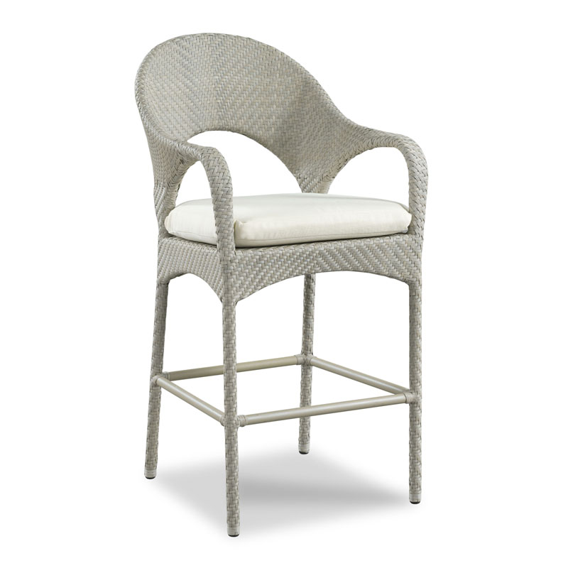 A curved back rests above a loose Sunbrella upholstered cushion raised by rounded legs. The stainless steel frame is covered with intricate weaving in our Floral Grey hue. Complete your dining or entertainment space with the Ventana Outdoor bar stool.Read More